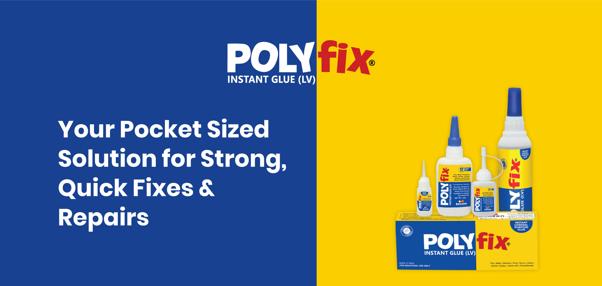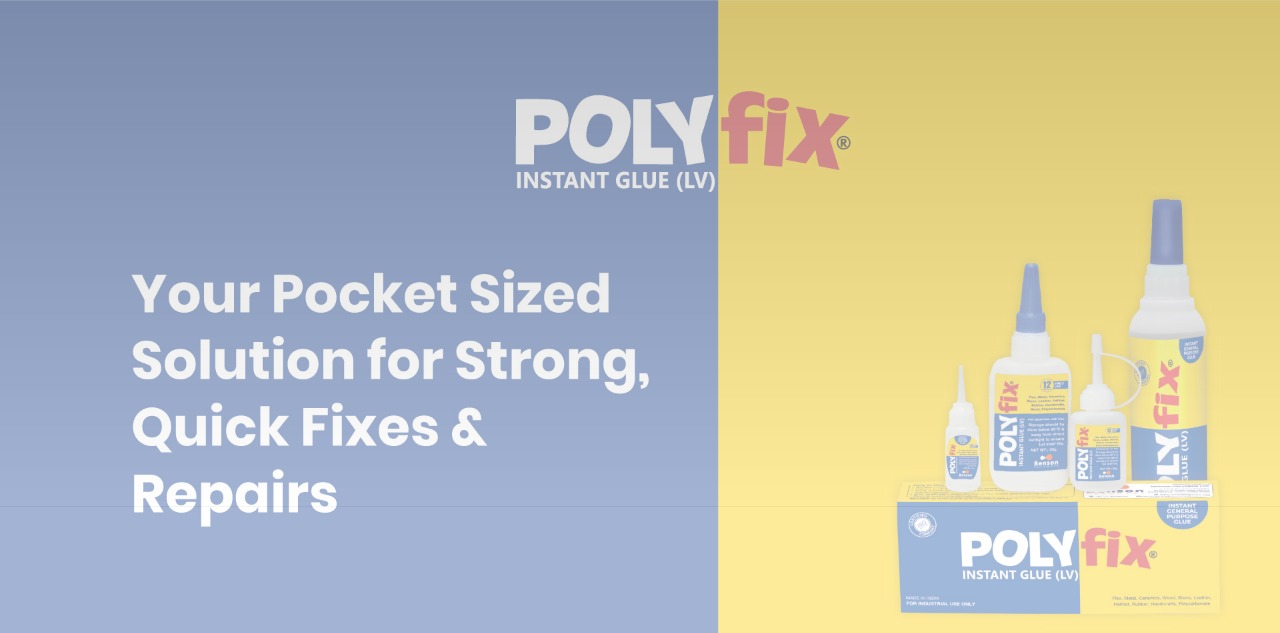 At Benson, we offer a wide range of innovative adhesive products for wide range of applications marketed under our brands, POLYFIX, POLYWOOD, POLYVAM, HIGHTACK, DROPBOND, RUSTIX & AUTON SEALER. Our Products are highly popular and market leaders in their respective industry segments. We offer a wide range of adhesives such as low, medium & high viscosity cyanoacrylate, water-based adhesives, footwear adhesive, artificial nail glue, fabric glue, wood instant glue/ seal/ emulsion, metal bonding, PVC door/ windows instant glue, automotive & construction adhesive, flex glue for backdrops & banners, screen printing frames etc.